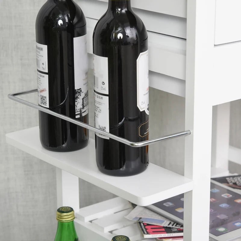 Profitez de sa large surface de travail pour préparer vos plats préférés, tandis que ses trois tiroirs élégants et paniers métalliques amovibles gardent vos essentiels à portée de main. Avec ses étagères supplémentaires, porte-bouteilles intégrés, et roulettes pivotantes à 360°, elle se déplace facilement où vous le souhaitez.