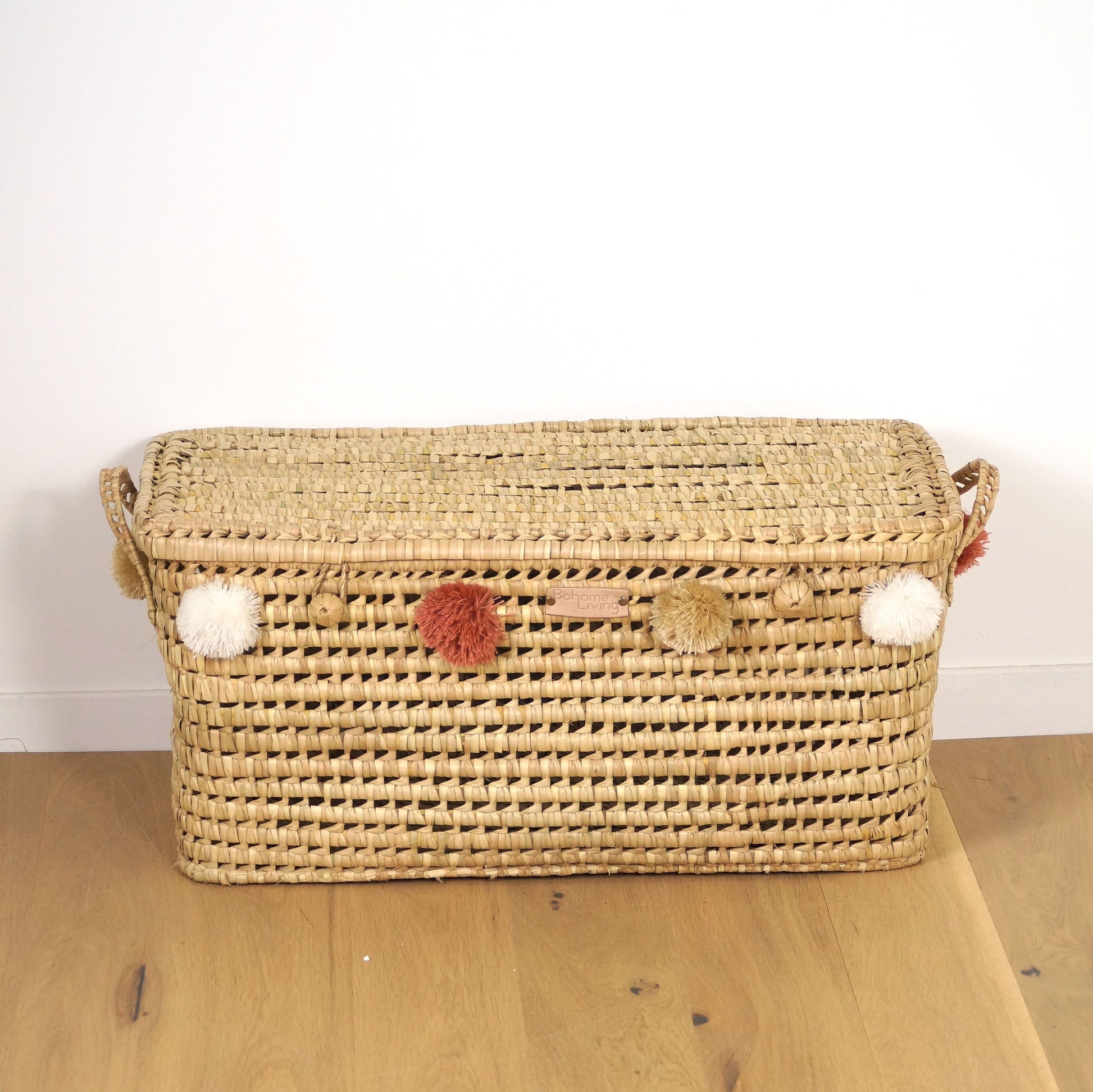 Transformez votre espace de vie avec notre élégante malle de rangement en feuilles de palmier de 80 cm, ornée de pompons. Idéale pour organiser les jouets des enfants et les objets du quotidien, cette malle artisanale marocaine allie esthétique naturelle et fonctionnalité.